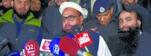 Pakistani leader of the Jamaat-ud-Dawa (JuD) organisation Hafiz Saeed (C) speaks to the press after being detained by police in Lahore, early on January 31, 2017.
